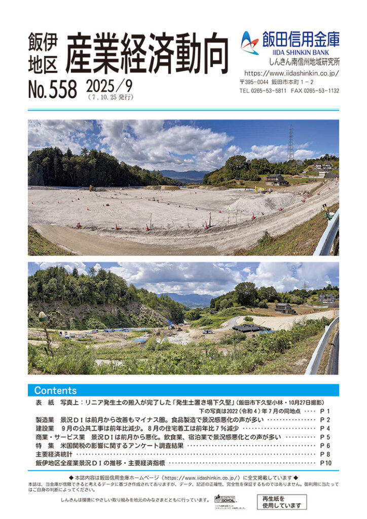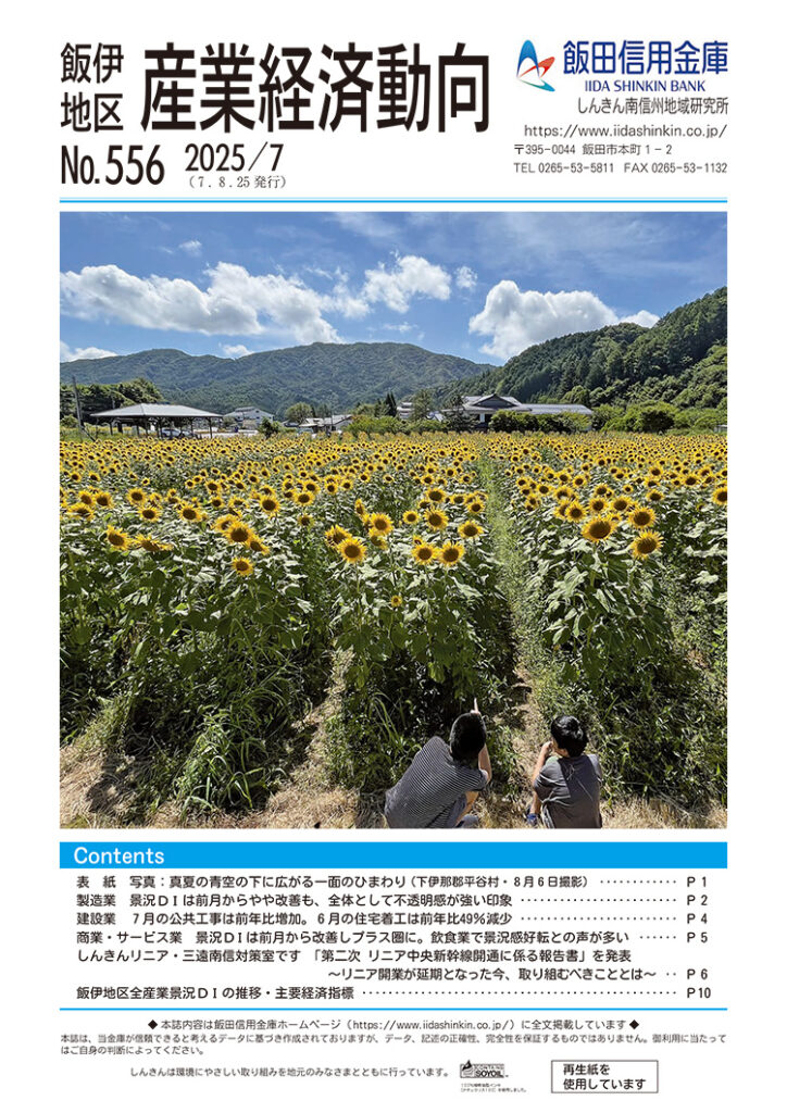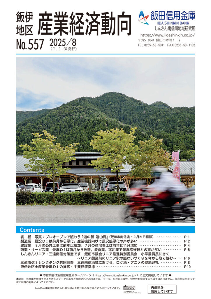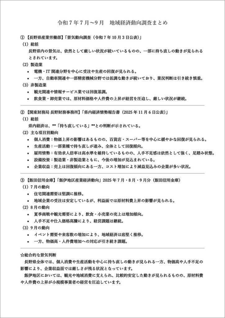 南信州南部エリア(阿南町・売木村・天龍村・下條村・泰阜村)商工会では、長野県産業労働部が公表している「景気動向調査」、関東財務局長野財務事務所が公表している「県内経済情勢報告書」、飯田信用金庫が公表している「飯伊地区産業経済動向」の各機関が公表している景気動向調査を収集し、その結果を纏めて公表しています。以下は調査まとめ資料と各機関公表資料です。地域経済動向把握に是非ご活用下さい。